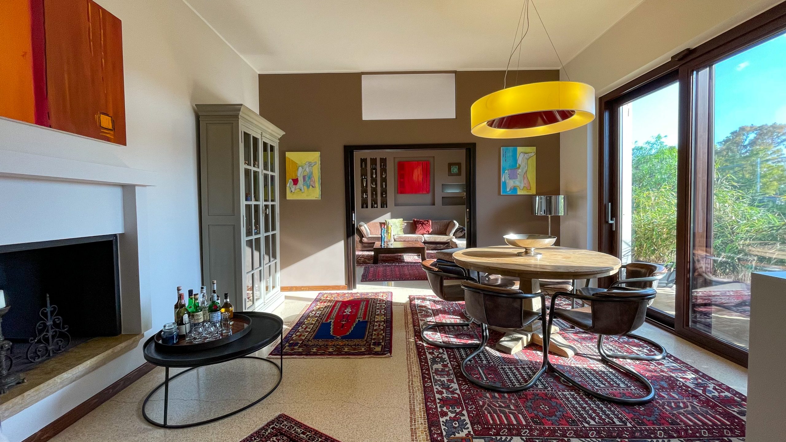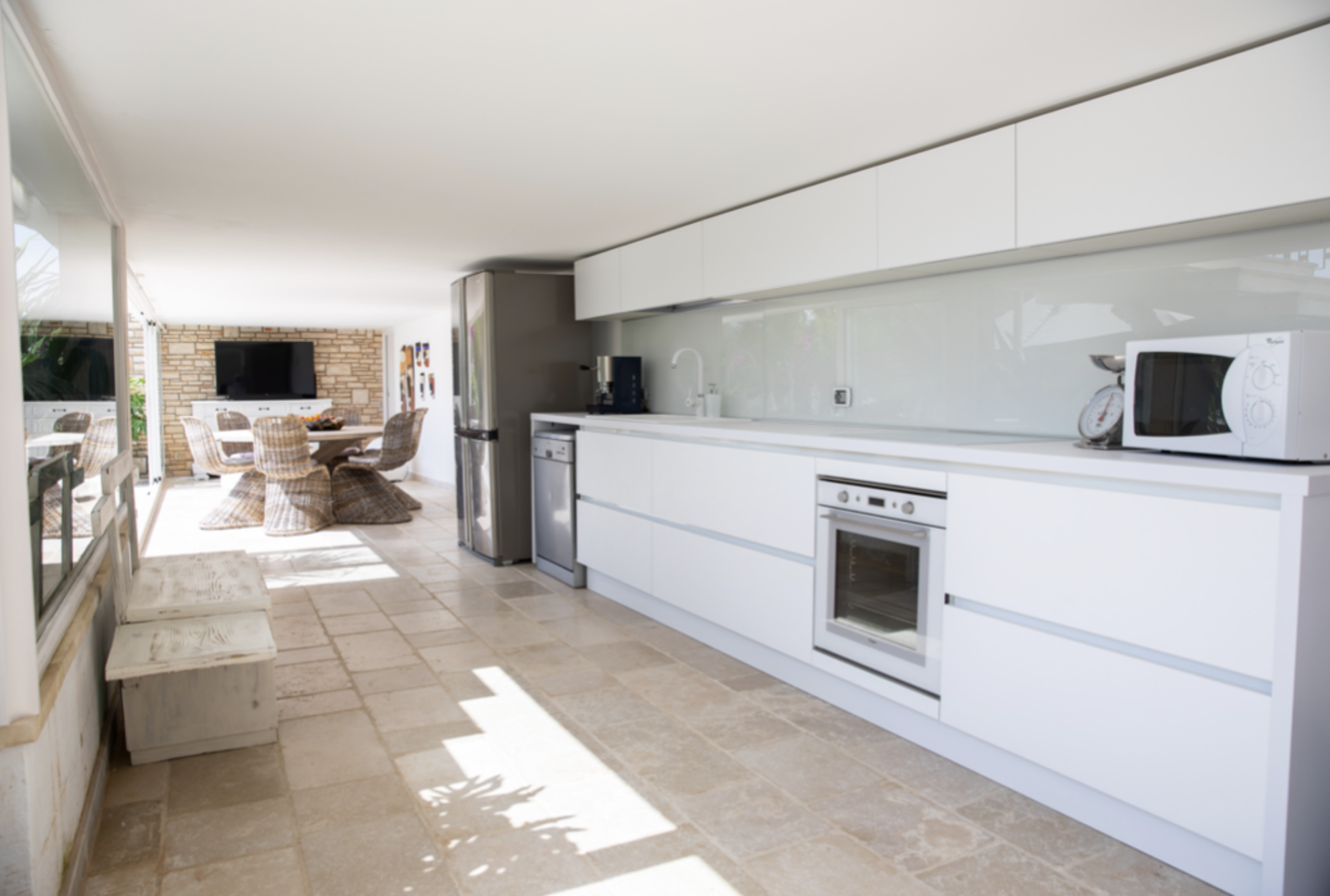 In the elegant outdoor patio facing the swimming pool, you’ll find a sunbathing area adorned with refined loungers and finely embroidered umbrellas, offering both style and comfort. The outdoor terrace also includes a spacious, fully equipped kitchen, perfect for enjoying open-air meals with family and friends.