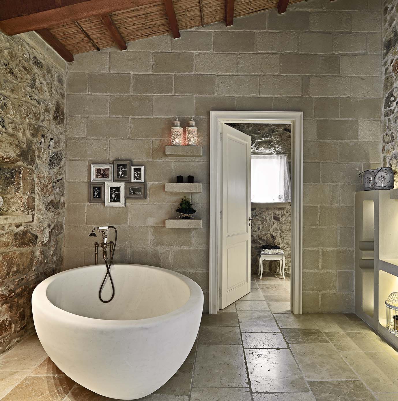 Minimalist yet charming, the Grapefruit Room evokes the soft, rosy hues of its namesake fruit. The light and airy ambiance begins with an entrance corridor that separates the bathroom and the bedroom. Details such as stone rosettes and carved corbels in Lecce stone reflect the timeless beauty and tradition of the region.