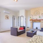 The villa features three elegantly furnished bedrooms in a modern minimalist style, a living room with a sofa bed, a fully equipped kitchen, and spacious outdoor areas with a sea view.